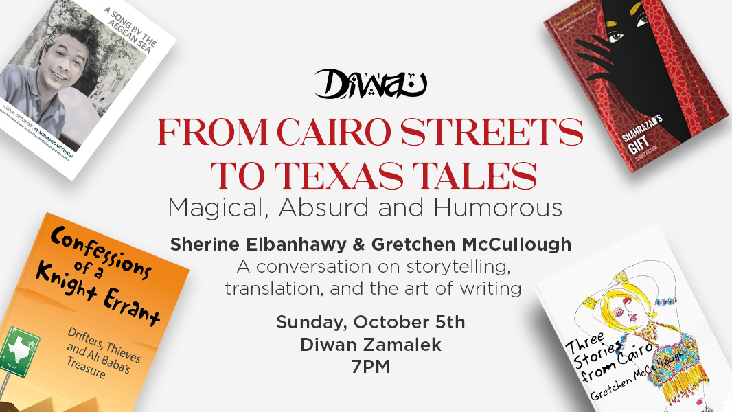 From Cairo streets to Texas tales: magical, absurd and humorousSherine Elbanhawy & Gretchen McCullough in conversation on storytelling, translation, and the art of writing.Sunday, October 5thDiwan Zamalek7PM