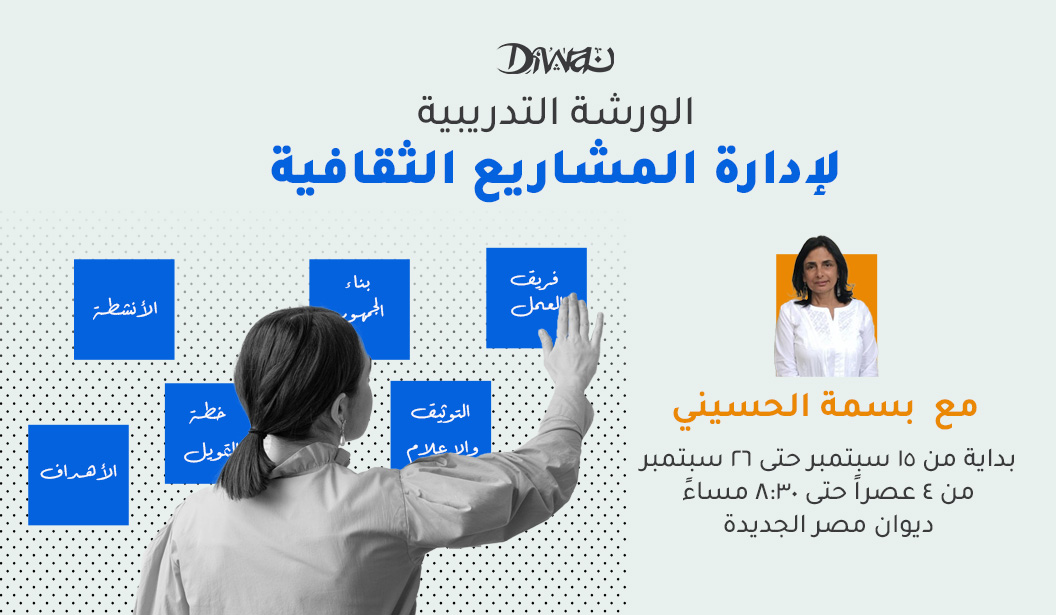 الورشة التدريبية لإدارة المشاريع الثقافية مع بسمة الحسينيبداية من ١٥ سبتمبر حتى ٢٦ سبتمبرديوان مصر الجديدةمن ٤ عصراً حتى ٨:٣٠ مساءً لمزيد من التفاصيل