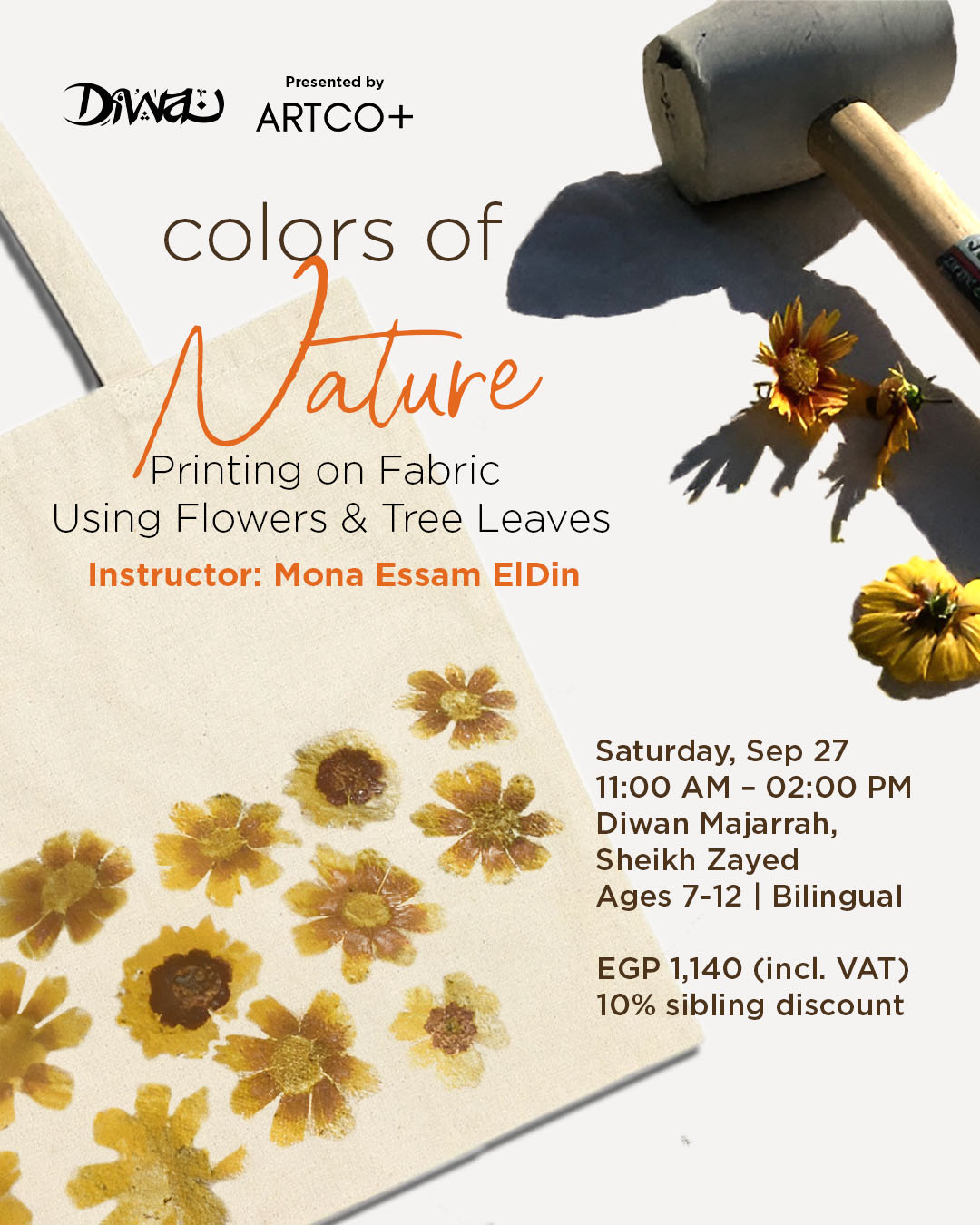 In this workshop, we will learn new printing techniques by using remnants of flowers and trees to print on fabric such as t-shirts or small boards. Using a hammer, we will first create a design with the flowers on a piece of fabric, then gently hammer the flower pieces to transfer their natural colors onto the fabric.