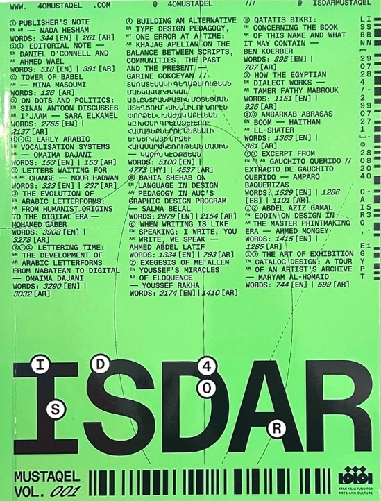 Isdar Mustaqel is an Arabic-English non-periodical paperback on design practices that is serious, critical and playful. Isdar aims to initiate discussions, develop ideas, continue conversations and experiment with designs that balance theory with practical experience, contributing to the development of a design discourse that engages communities on the margins of Western-centric design practices and conversations.