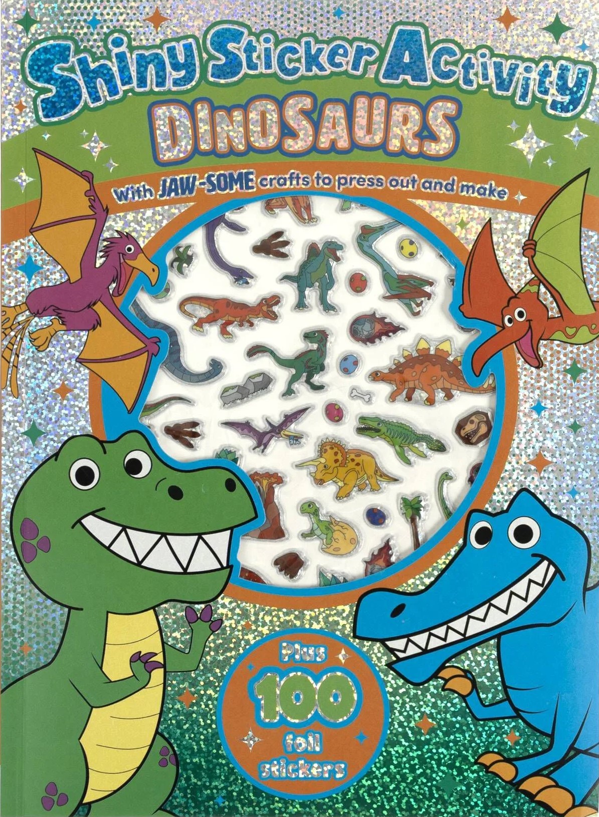 (1) Dinosaurs :- Stomp away to a world of prehistoric activity fun! Match the Dino pairs, help the T.rex get back to his cave, and then press out your card pieces to make fang-tastic dinosaur crafts. Includes 100 Super shiny foil stickers.